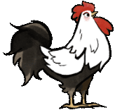 A cartoon rooster with a white body, black tail, and red comb stands still, looking to the side.