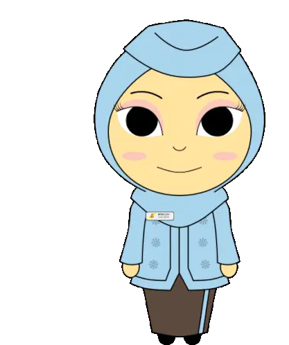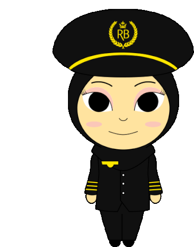 Animated sticker of a cute female pilot from Royal Brunei Airlines, wearing a black uniform and cap, waving hello.