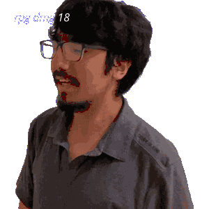 a pixelated image of a man wearing glasses with the number 18 on his forehead