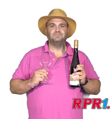 RPR1's Kunze, a man in a pink shirt and straw hat, joyfully holds a bottle of wine and a glass.