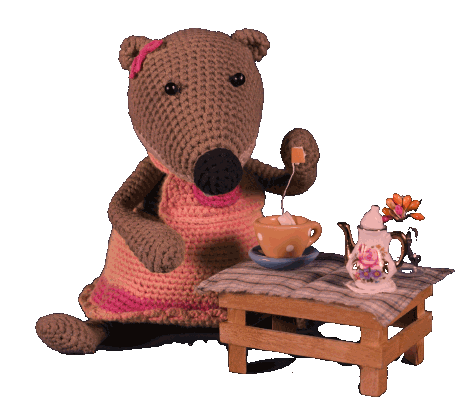 a stuffed animal is sitting at a table with a teapot and cup of tea
