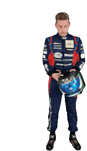 Dominique Schaak, in his Rssocialmedia Motorsport Magdeburg racing suit, puts on his helmet and gives a confident thumbs-up.