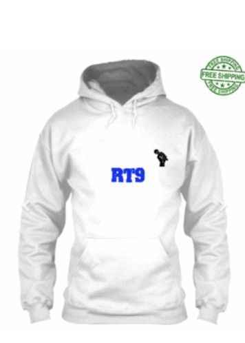 A white hoodie featuring the 'RT9' logo and a small black silhouette, with a 'Free Shipping' badge.