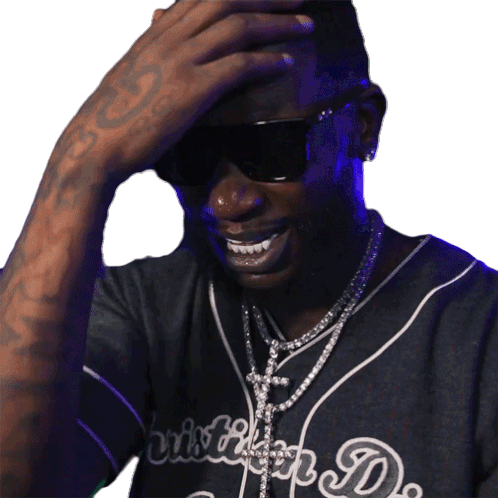 Gucci Mane, wearing sunglasses and a baseball jersey, rubs his head in frustration, looking stressed.