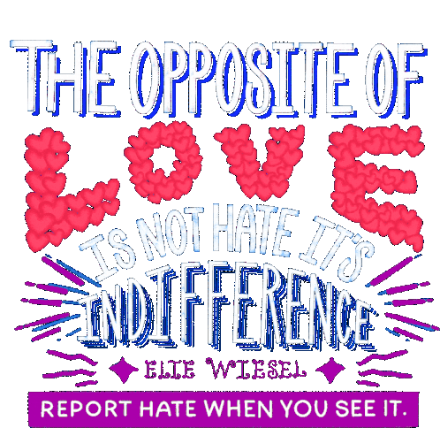 A powerful quote by Elie Wiesel: 'The opposite of love is not hate, it's indifference.' Encourages reporting hate.