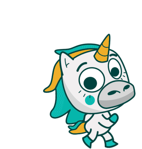 A cute cartoon Rukita unicorn with a teal mane and yellow horn trots playfully.