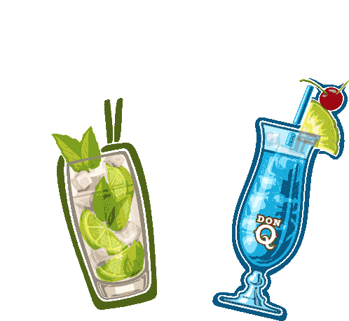 Two vibrant rum cocktails, including a Don Q blue drink and a mojito, clinking in a festive cheers animation.