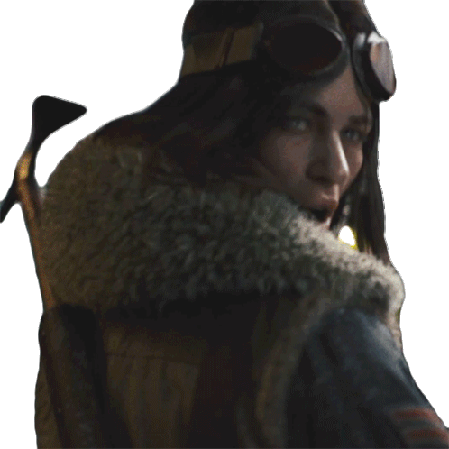 A Call Of Duty character, wearing goggles and a fur-lined collar, urgently shouts 'RUN!' looking over her shoulder.