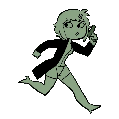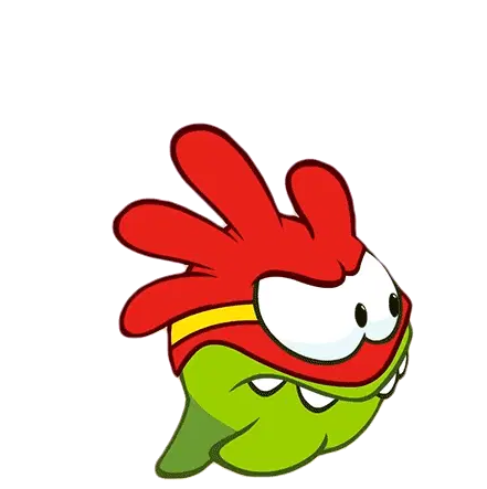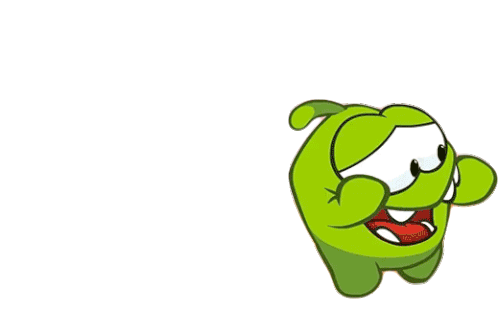 Om Nom, the green monster from Cut The Rope, runs away with a scared expression, looking over his shoulder.