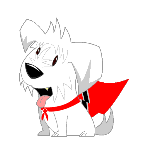 A cartoon blue dog with a red superhero cape and lightning bolts runs energetically, embodying a playful hero.