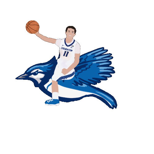 Ryan Kalkbrenner, the Creighton basketball star, is depicted flying on the back of Betty the Bluejay mascot.