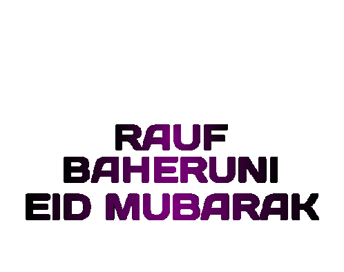 Rauf Baheruni Eid Mubarak text in purple and black, rotating on a white background.