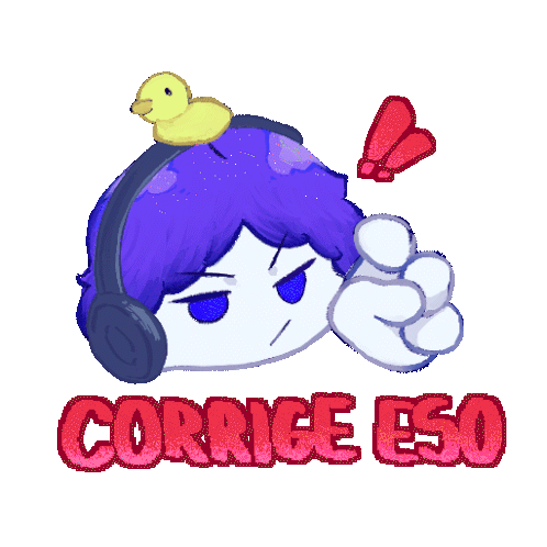 Ryder Omori Uac, a cartoon character with purple hair and headphones, points with a duck on his head, displaying 'CORRIGE ESO'.