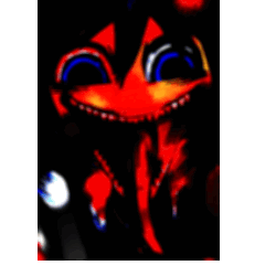 A terrifying red and black anime-style face with glowing blue eyes and a wide, toothy grin, designed for a horror jumpscare.