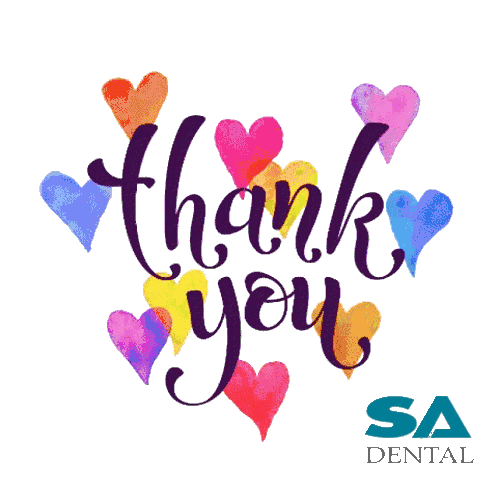 A heartfelt 'Thank You' message surrounded by animated watercolor hearts, featuring the SA Dental logo.