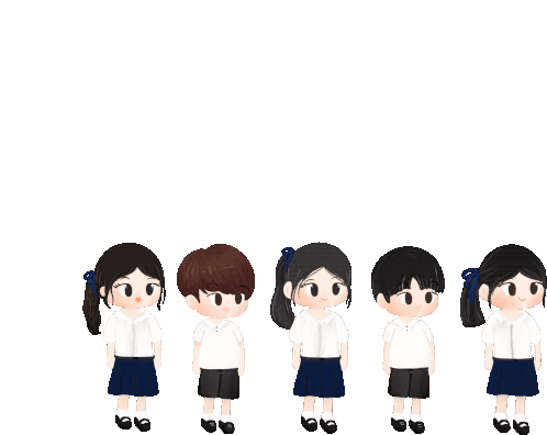Chibi-style children in school uniforms standing in a row, featuring both boys and girls in a cute illustration.