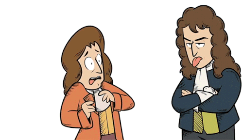 Isaac Newton sticks his tongue out at Robert Hooke, making him cry. A cartoon depiction of historical figures.