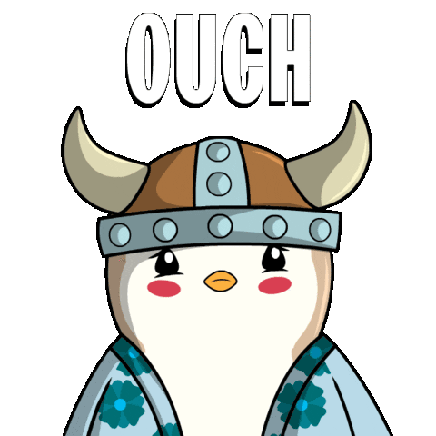 A cute Pudgy Penguin character wearing a Viking helmet looks sad and says 'Ouch' with rosy cheeks, expressing pain.