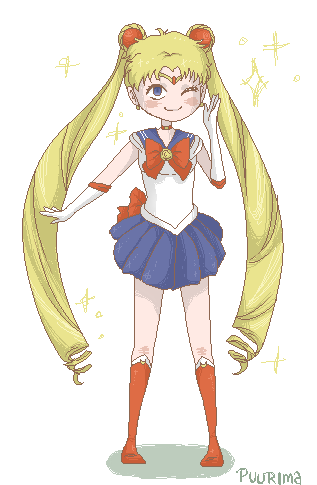 Sailor Moon, in a charming pixel art style, winks and strikes a pose, showcasing her iconic long blonde pigtails and sailor uniform.