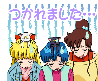 Sailor Moon characters Ami Mizuno, Minako Aino, and Makoto Kino, along with Luna and Artemis, look utterly exhausted, with sweat drops and the Japanese text 'つかれました'.