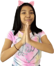 Keira Charma, a young girl with cat ears, offers a friendly 'Salam' greeting with hands together.