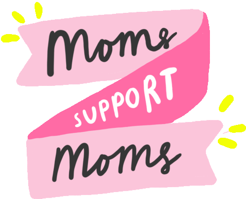 A vibrant pink ribbon sticker featuring the empowering message "Moms SUPPORT Moms" in a stylish font, celebrating mutual support.