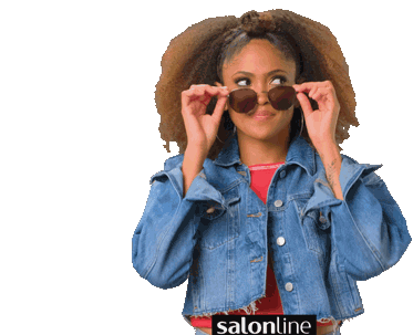 Juliana Gomes (Ju Black) from Salon Line, wearing a denim jacket, looks skeptical while holding sunglasses.