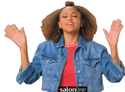 Juliana Gomes, a woman with beautiful curly hair, smiles with hands together in a prayer gesture for Salon Line.