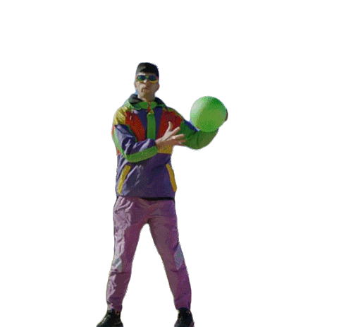 Bejo, dressed in a vibrant tracksuit, throws a green ball and watches it bounce, showcasing playful energy.