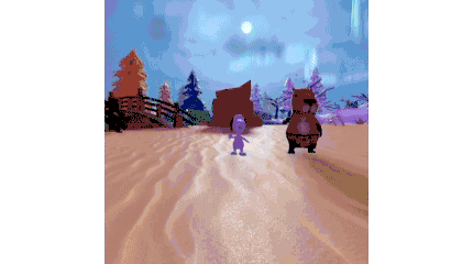a video game scene with a purple character and a brown animal