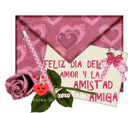 A heartfelt message 'Feliz Dia Del Amor Y La Amistad Amiga' on an envelope, adorned with a rose and pencil, perfect for Valentine's Day.