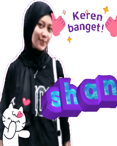 a woman in a hijab is standing next to a purple sign that says keren banget