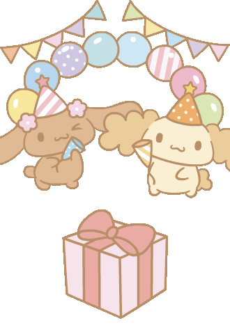 Sanrio characters Cinnamoroll and Pompompurin celebrate a birthday with balloons and confetti, as Cinnamoroll pops out of a gift box.