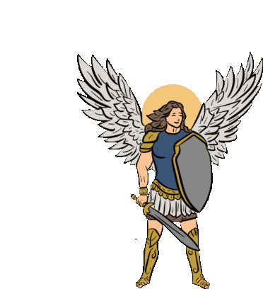 an angel is holding a sword and shield .