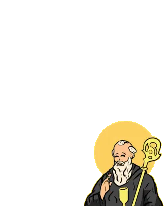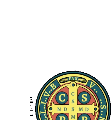 Um emblema dourado de São Miguel Arcanjo, segurando espada e balança, pisando sobre um demônio, em estilo de moeda.