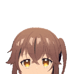 Anime girl from Sasaki And Peeps peeking from the bottom of the frame, with brown hair and expressive yellow eyes, gently bobbing her head.