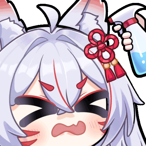 Anime character Satsuki Mei looks annoyed as she gets sprayed with water from a bottle.