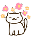 A cute Neko Atsume cat with a serene expression, surrounded by floating pink and yellow flowers.