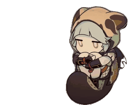 Sayu, the chibi character, is seen curled up in a ball, appearing to be sleeping or resting peacefully.