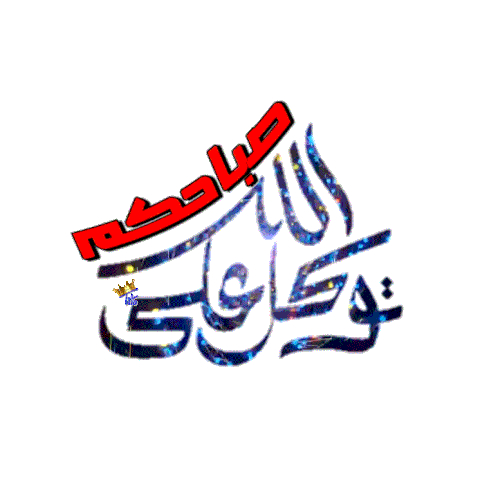 Vibrant animated Arabic calligraphy wishing 'Good morning, trust in God' with sparkling effects.