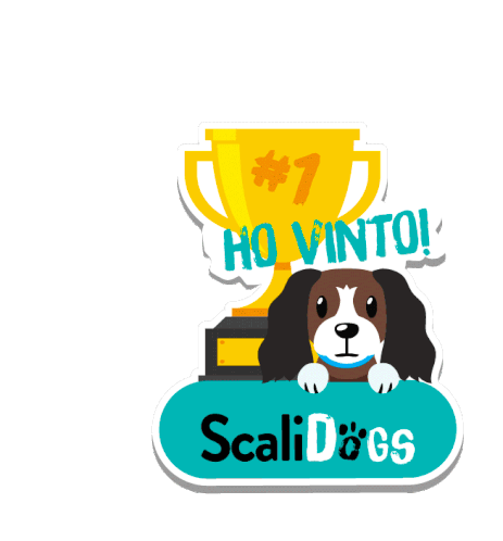 A cheerful ScaliDogs sticker featuring a cute dog peeking from behind a golden trophy, celebrating a #1 win.