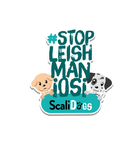 Animated sticker featuring two cute puppies, a poodle and a dalmatian, with the message #STOPLEISHMANIOSIS and ScaliDogs.