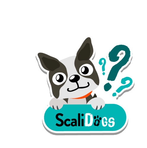 a sticker of a dog with a question mark and scalidogs written on it