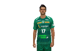 Martin Larsen, a handball player for SC DHfK Leipzig, celebrates with a fist pump in his green jersey.