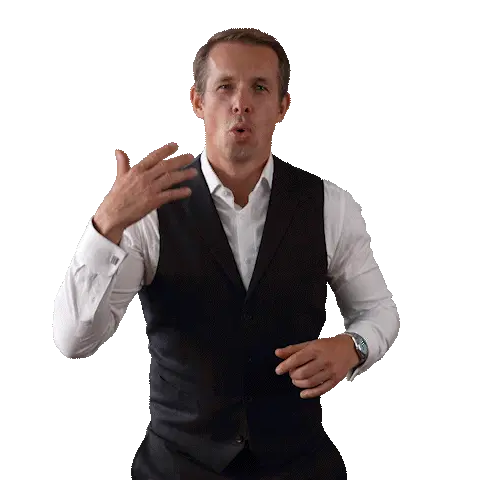 a man in a blue suit holds a sign that says zu verkaufen