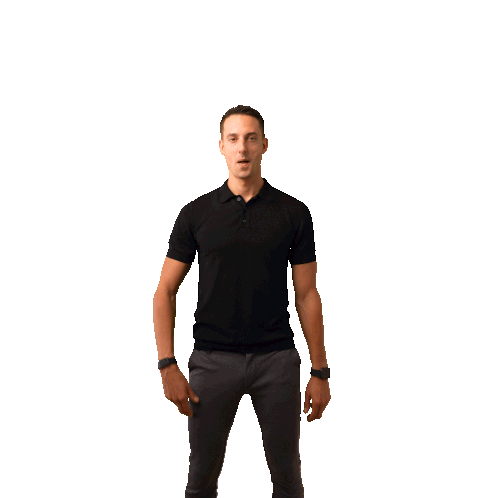 a man in a black shirt and gray pants is pointing upwards