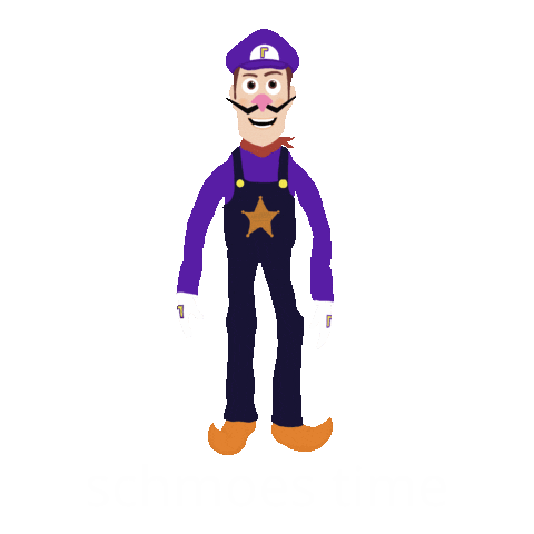 Waluigi from Schmoes Time, a cartoon character with a purple hat and overalls, featuring a star on his pants.