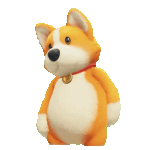 A cute cartoon dog with a red collar and bell adorably scratches its ear with a hind leg.