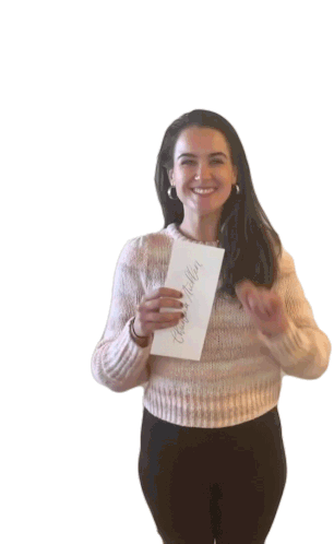a woman in a white sweater is holding a piece of paper that says ' i love you '