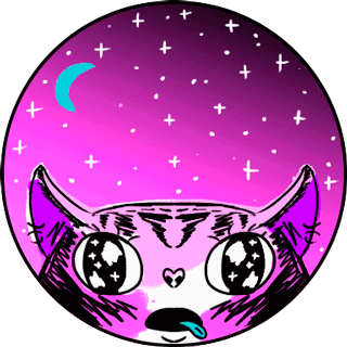 An animated sticker of a stylized purple cat's head with large eyes, set against a starry pink and purple night sky.